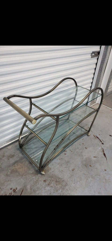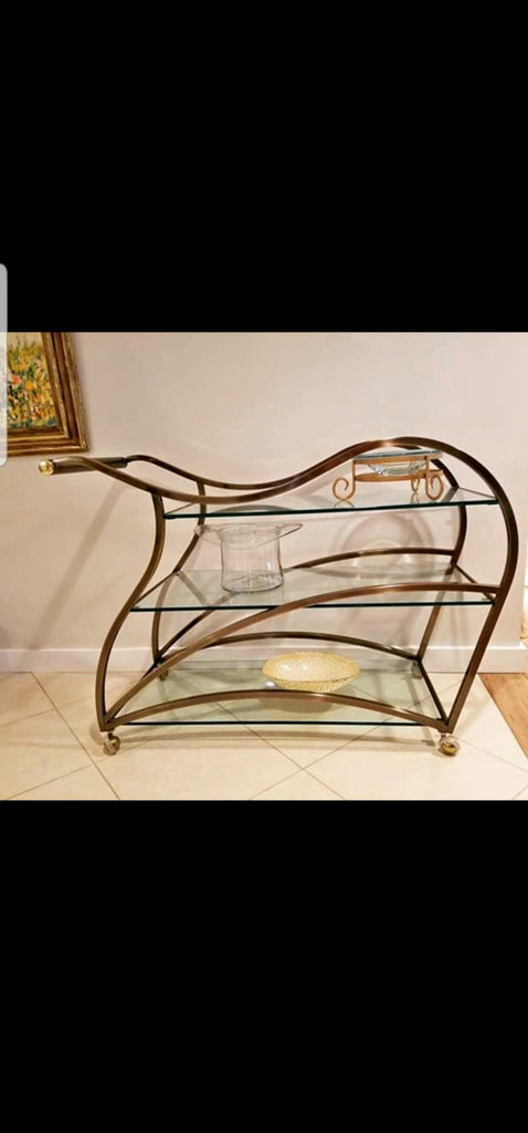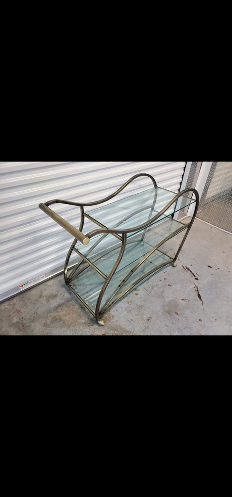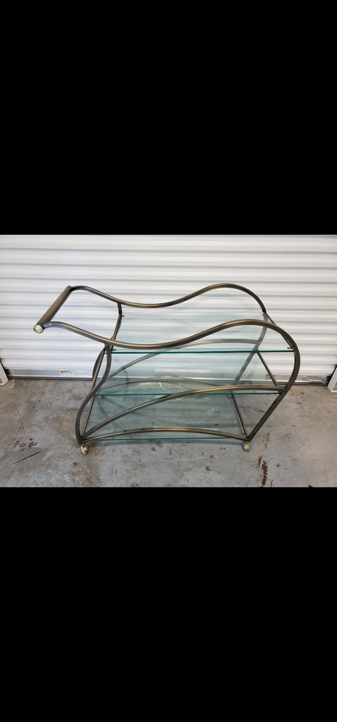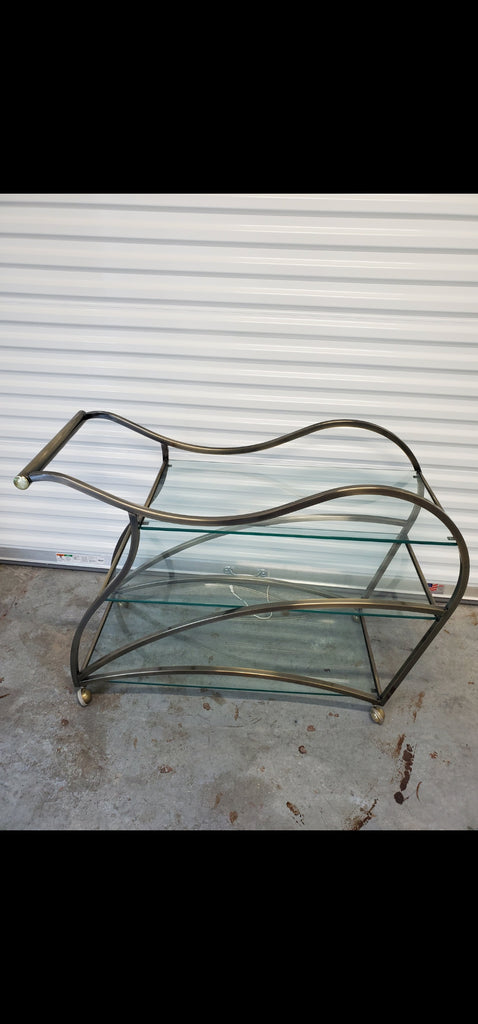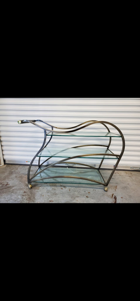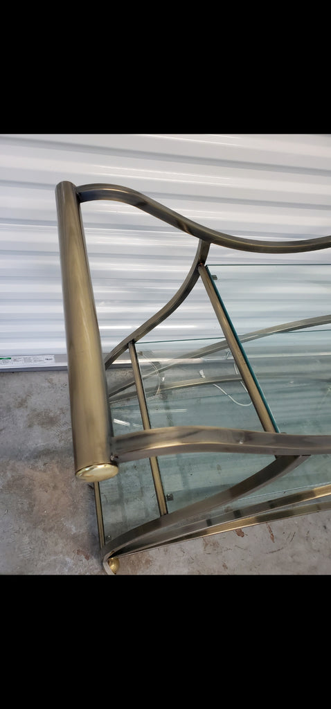 VINTAGE MID CENTURY MODERN HOLLYWOOD REGENCY DIA/ MILO BAUGHMAN SCULPTURAL METAL BRUSHED BRASS N GLASS SERVING/ TEA/ BAR CART ON CASTORS